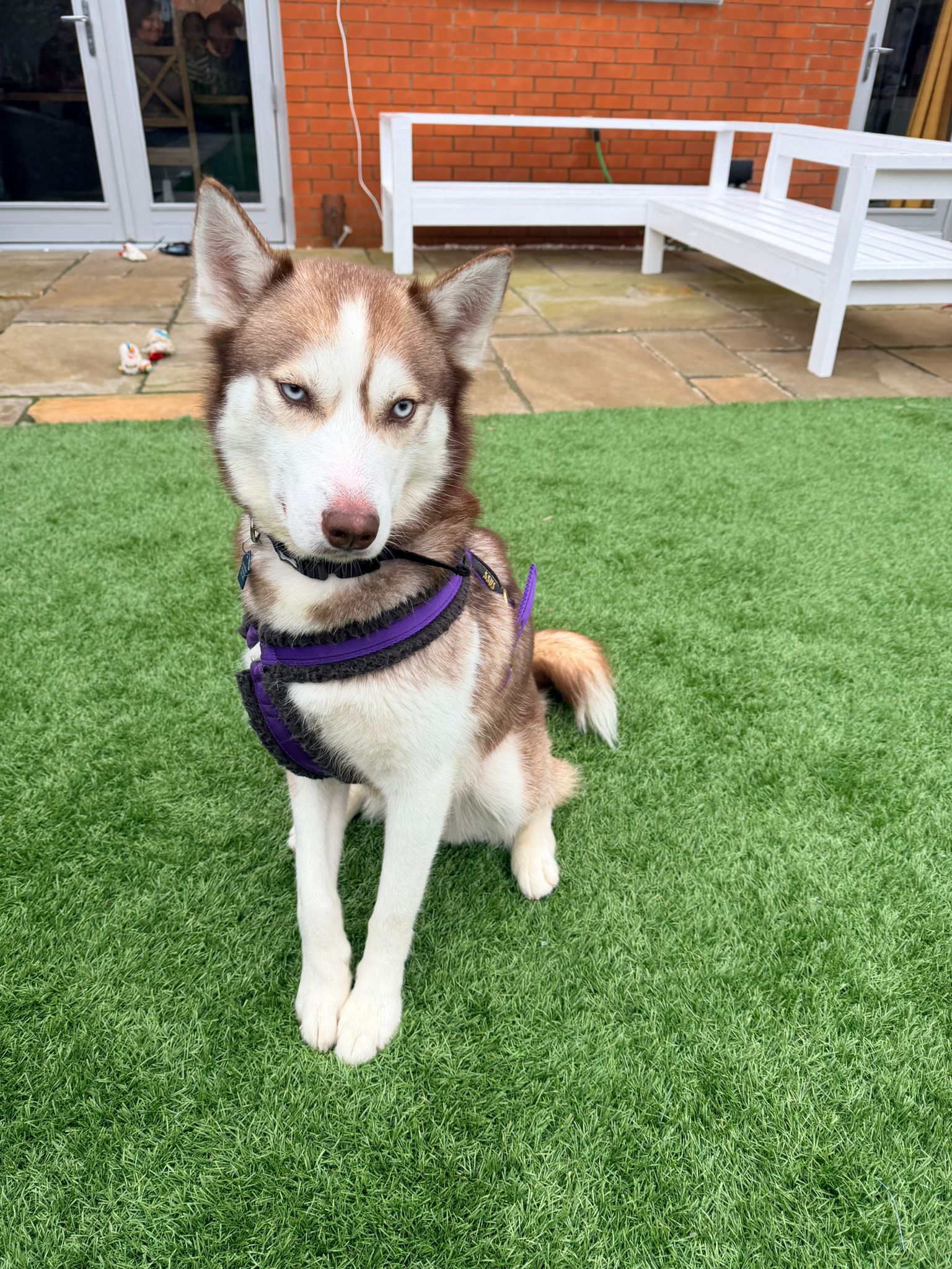 Frankie loves being outside, so he is looking for an active home committed to his ongoing training. We believe he’s quite young and has some learning to do – he is very smart and has already learnt some commands whilst in foster (he even knows how to open doors!). Frankie has shown some resource guarding tendencies around food, so his new home should be aware of this and support him with training. If sharing a home with other dogs, you will need to be able to provide separate feeding whilst he’s learning. Frankie does have a prey drive, so he can’t live with cats or small animals. We think he would be best suited with a dog of a similar size, that will be tolerant of his young and playful nature.